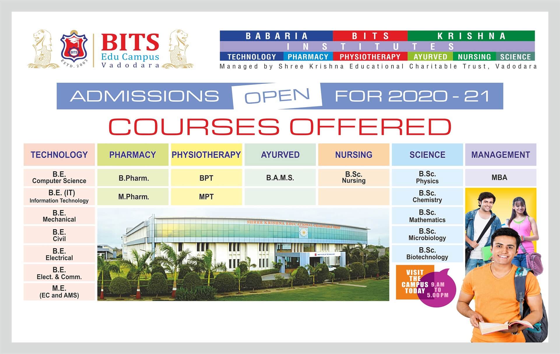 Admission to different U.G. affiliated Colleges is monitored centrally by Govt. of Gujarat through a central admission committee on the basis of merit at the qualifying examination each year in June – July
